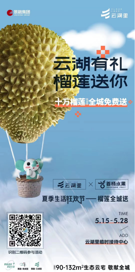 近日,贵阳景融云湖里联动首杨水果,十万榴莲现金券免费送,另赠入席VIP享98折购房特惠,识别二维码可参与活动。