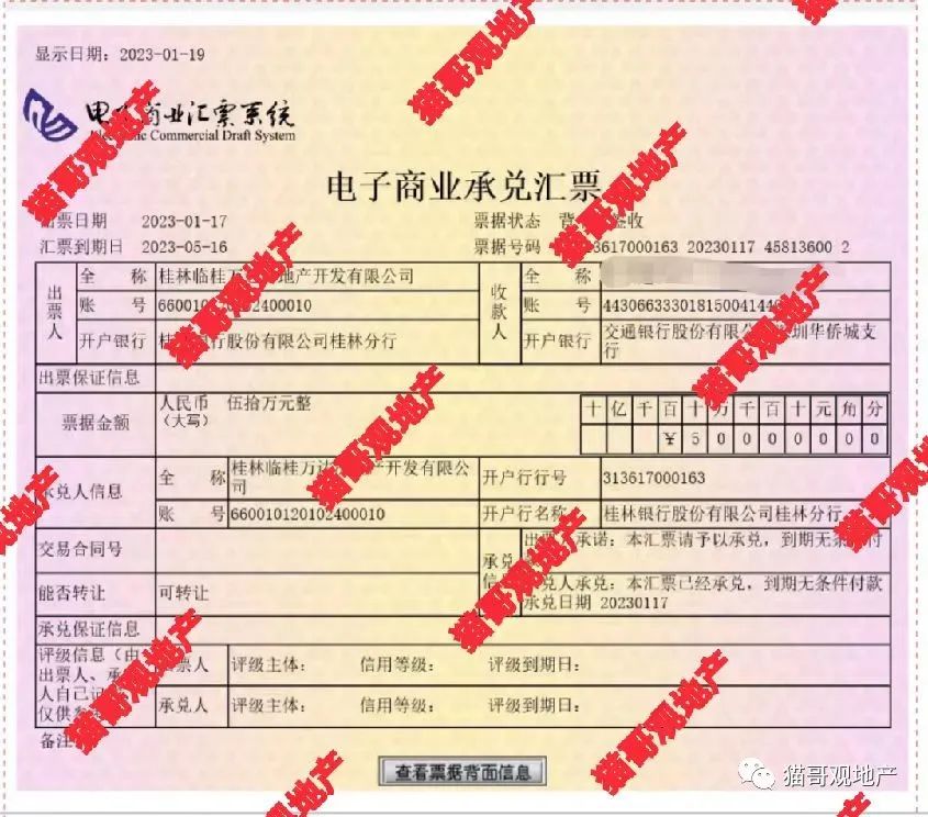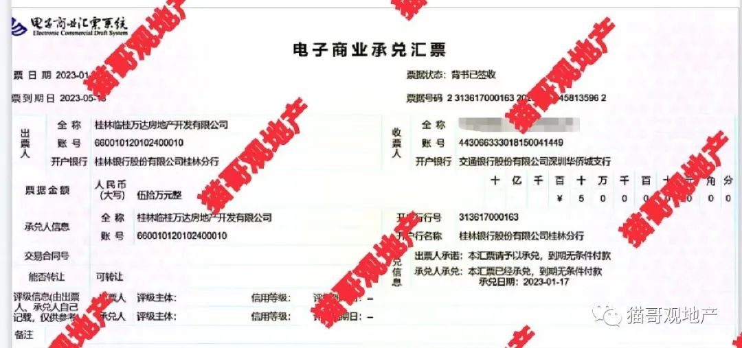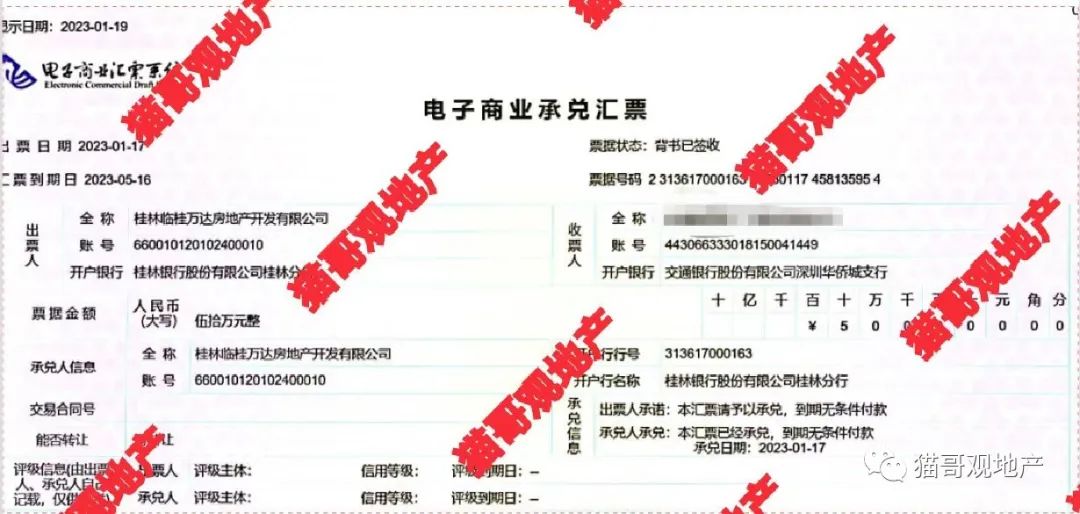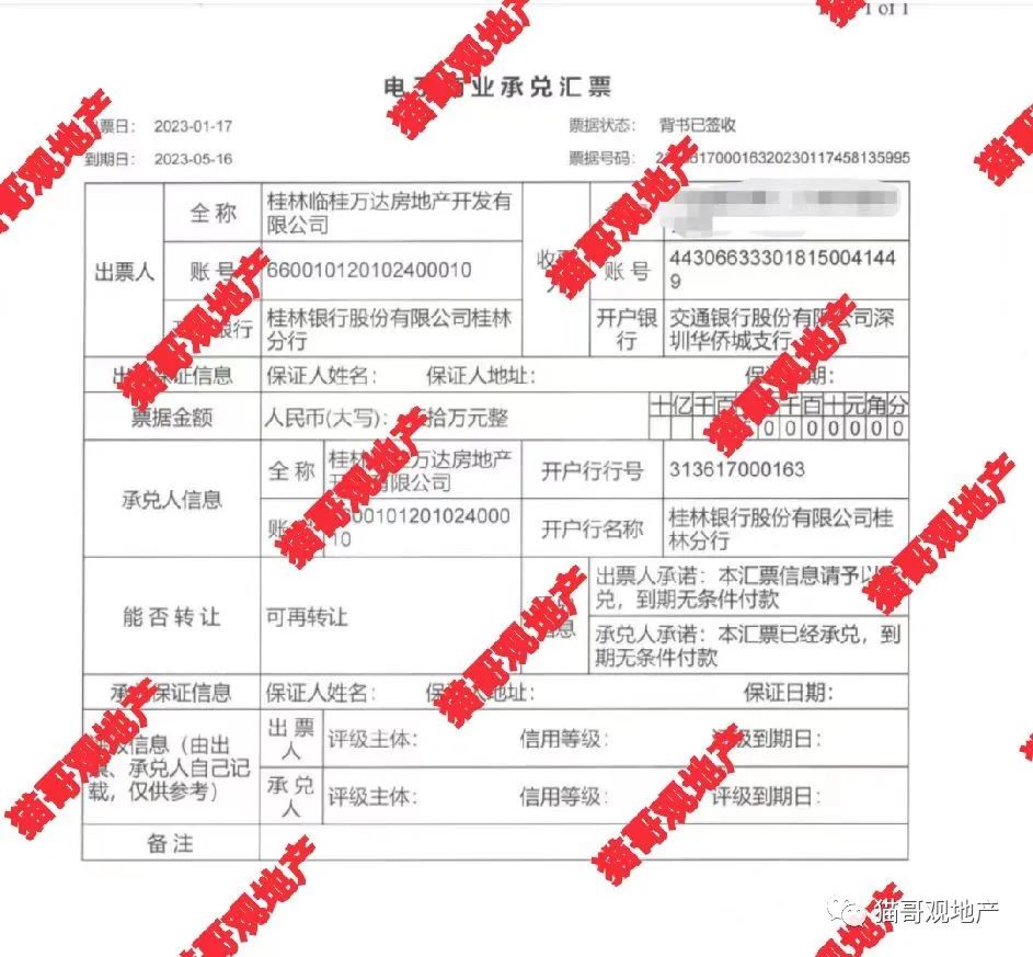 持票人告诉“猫哥”,万达之前是不开商票的,也看不上商票融资这种模式,去年开票也是短时间应急。不过,商票逾期这可不是一个好的信号,无数大型房企爆雷的前兆,就是商票出现公开“跳票”。比如之前的X大,比如之前的荣盛。