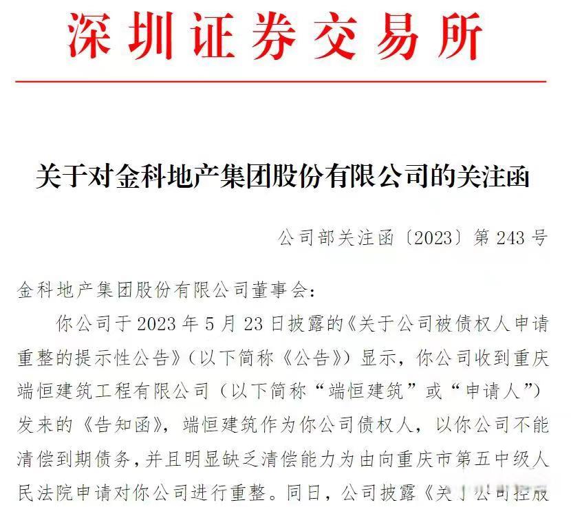 5月23日,金科股份(000656)发布公告,已于本月22日收到重庆端恒建筑工程有限公司(以下简称端恒建筑)发来的《告知函》,被债权人申请重整。
