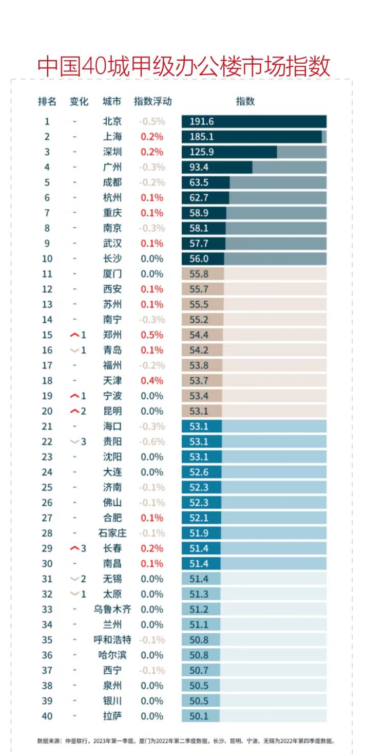 5月27日,仲量联行对外发布2023年一季度中国40城办公楼市场指数,其中贵阳因市场需求疲弱影响下,空置压力攀升,排名位次下降至22位,指数下降0.6%,位列第22名。