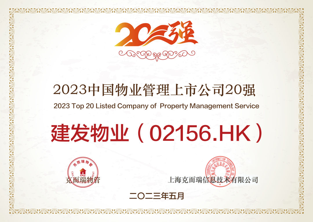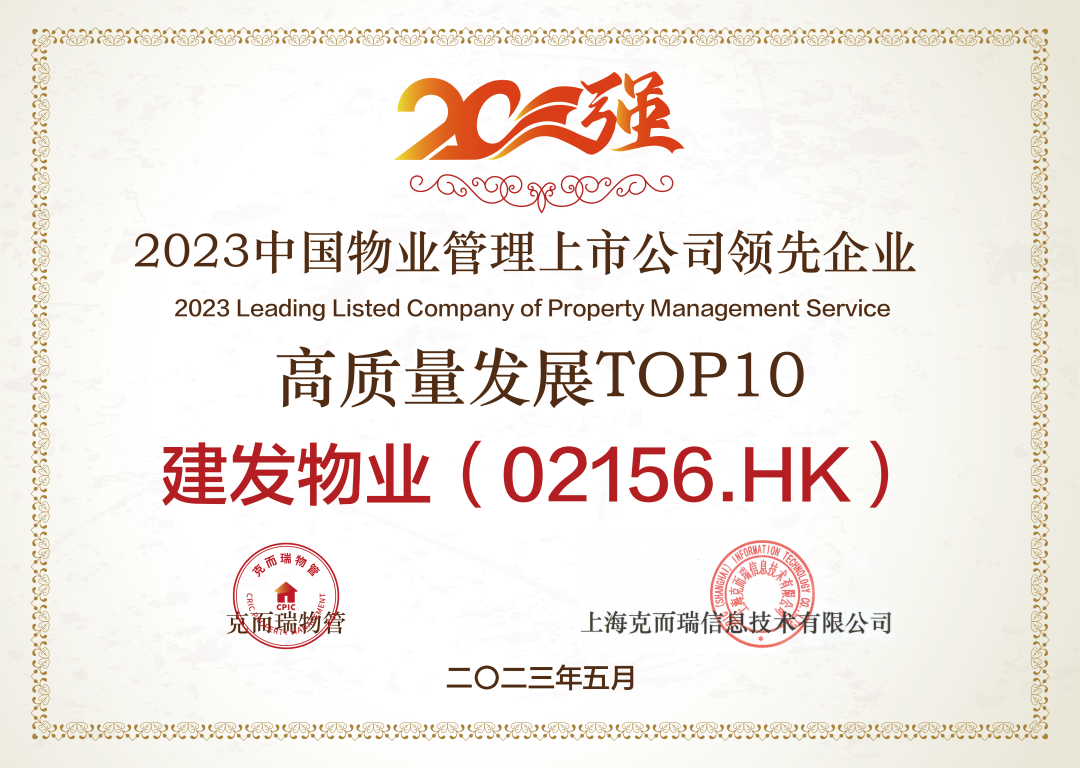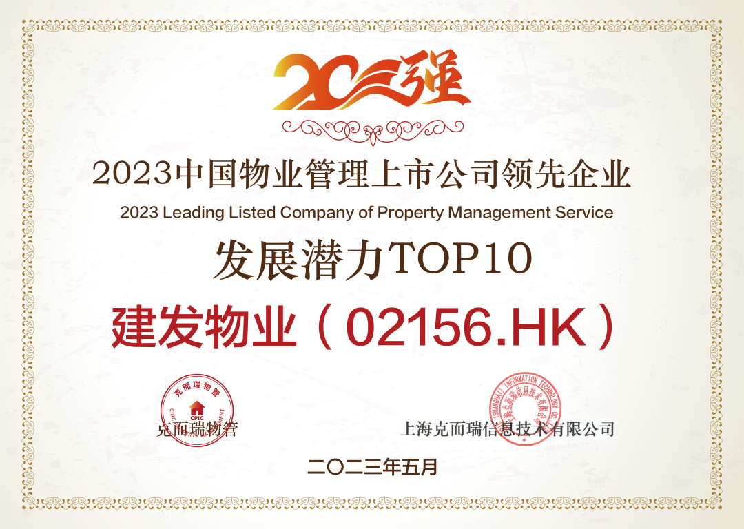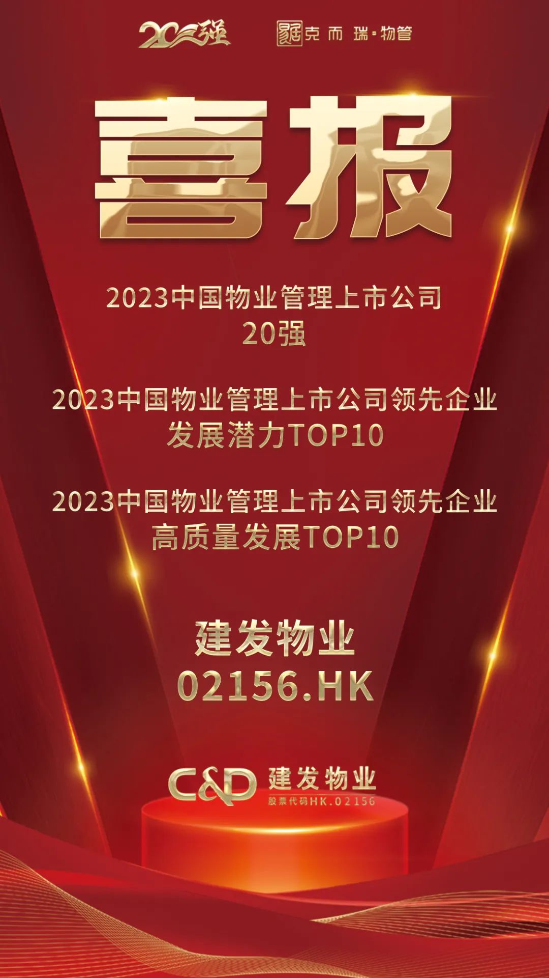 在「2023物业服务企业上市公司研究成果」中,建发物业荣获“2023中国物业管理上市公司20强”、“2023中国物业管理上市公司领先企业发展潜力TOP10”、以及“2023中国物业管理上市公司领先企业高质量发展TOP10”奖项。