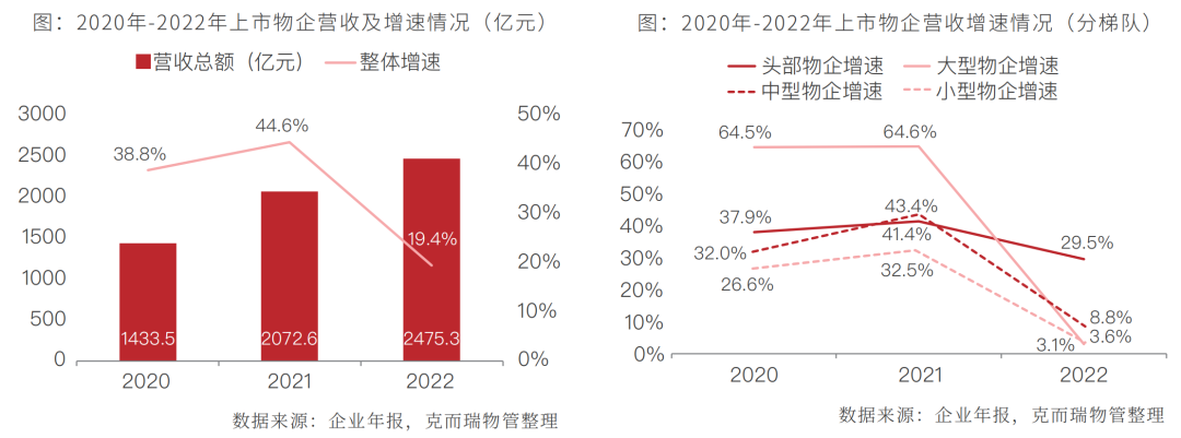 2022年披露营收总额的56家上市物企营收总额约2475.3亿元,同比增长19.4%,增速较去年同期下滑25.2个百分点。分梯队来看,头部、大型、中型和小型物企增速分别为29.5%、3.1%、8.8%和3.6%,增速同比分别下滑11.9、61.6、34.7和28.8个百分点。