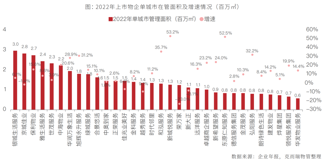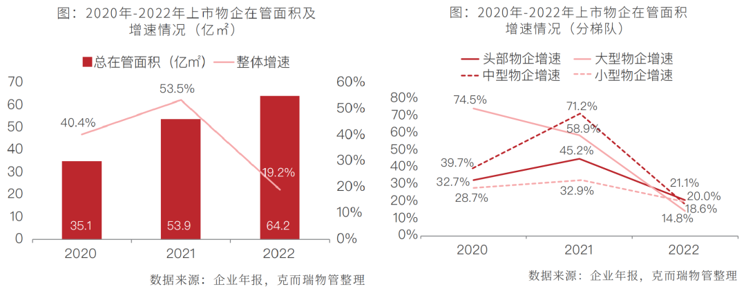 具体来看,完整披露相关面积数据的51家上市物企的总在管面积由2020年的35.1亿㎡增长至2022年的64.3亿㎡,三年复合增长率为35.3%;从增速走势来看,年内同比增长19.2%,较去年同期下滑34.3个百分点。
