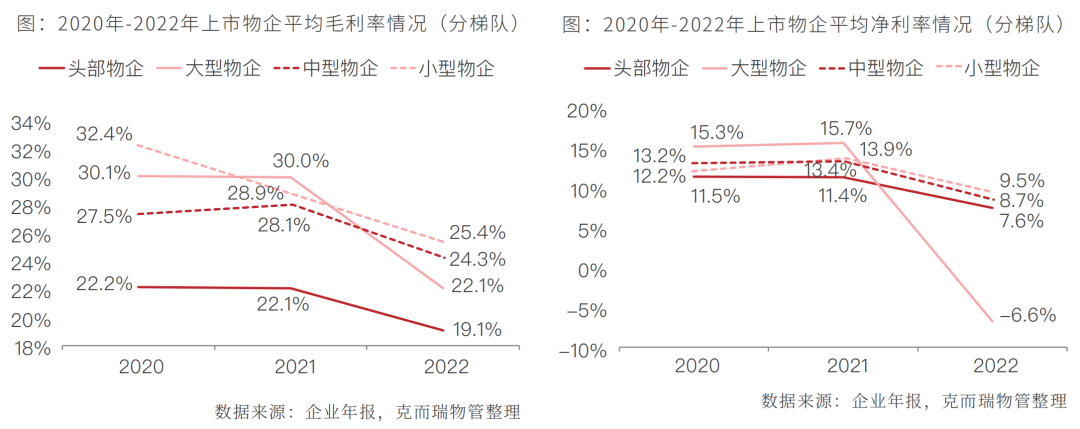 物企发展进入转折期,在全球经济发展放缓的背景下,房企三道红线带来的连锁反应,进一步扩大。此外,经过几年的快速发展期,物企业务发展逐渐成型,企业自身发展开始走向平缓。另外,疫情也为物企带来了大量的成本增加。多重作用下,2022年上市物企普遍呈现的利润及利润率下降的情况。