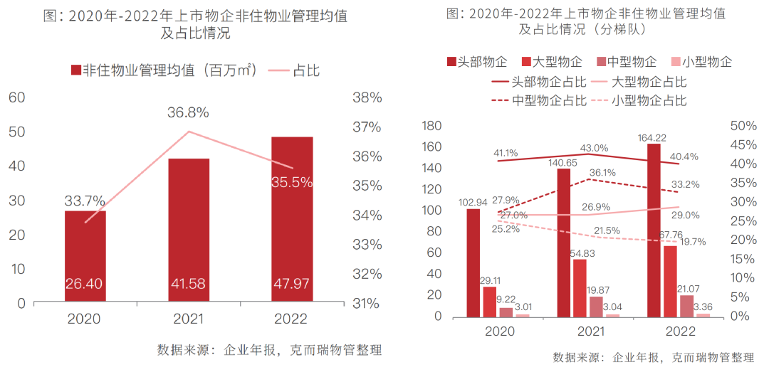 2022年披露完整数据的36家上市物企非住物业在管面积均值为48.0百万㎡,同比增长15.4%,在总在管面积占比为35.5%。分梯队来看,头部、大型、中型和小型物企非住物业在管面积均值分别为164.2、67.8、21.1和3.4百万㎡,占比分别为40.4%、29.0%、33.2%和19.7%。