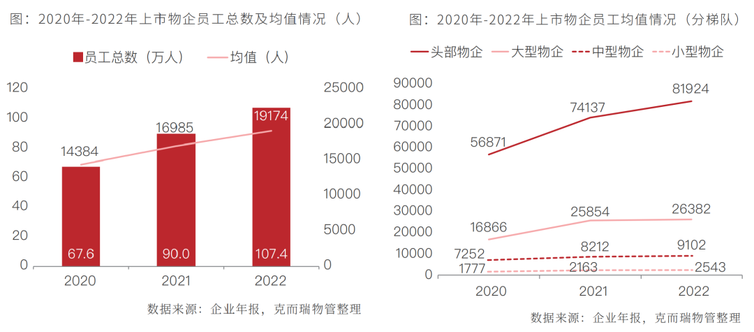 作为劳动密集型行业,物业服务企业一直是落实稳就业的重要力量之一。2022年,56家上市物企共吸纳就业人数107.4万人,同比增长19.3%;平均每家企业吸纳就业人数约19174人,同比增长12.9%。企业员工总数超过万人的企业有22家,占总人数的比重为86.4%。