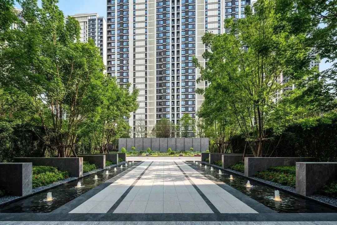 比如林荫会客厅空间,从入口进入翡翠公园翰林组团,以整齐的树阵造型排列在两侧,搭配飞扬的水景,提升整个空间的仪式感和序列感,在迎面将错落有致的阳光草坪,与精致的中心雕塑花境做呼应,在四周以林立的乌桕环绕,以植物的布阵全方位的焕活了会客厅。