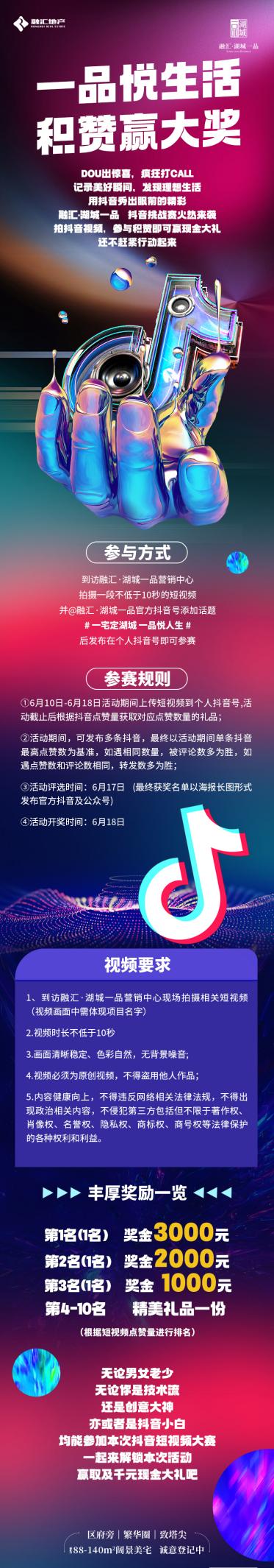 据了解,到访融汇湖城一品营销中心拍摄一段不低于10秒的短视频,并@融汇湖城一品官方抖音号添加话题#一宅定湖城一品悦人生#后发布在个人抖音号即可参赛。