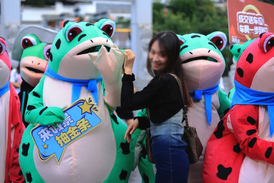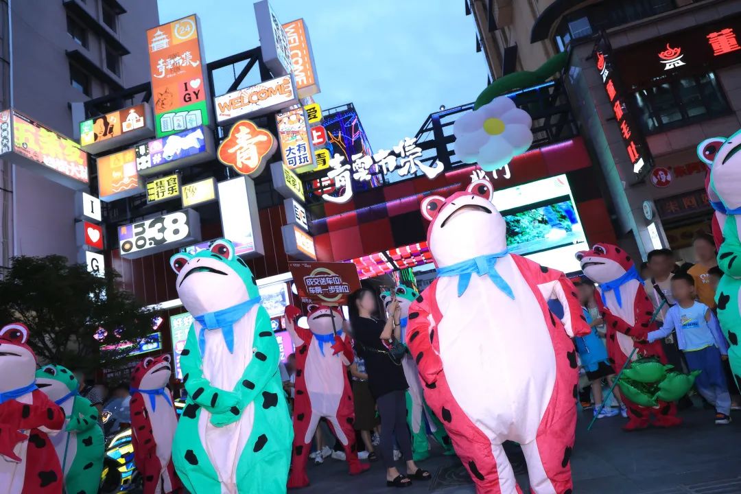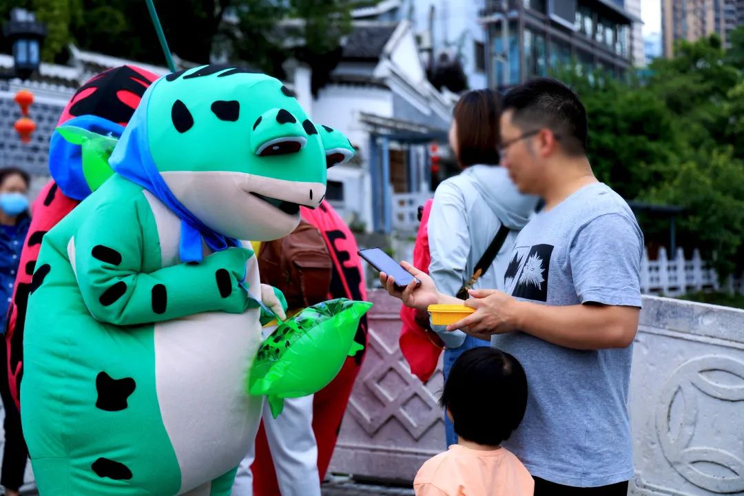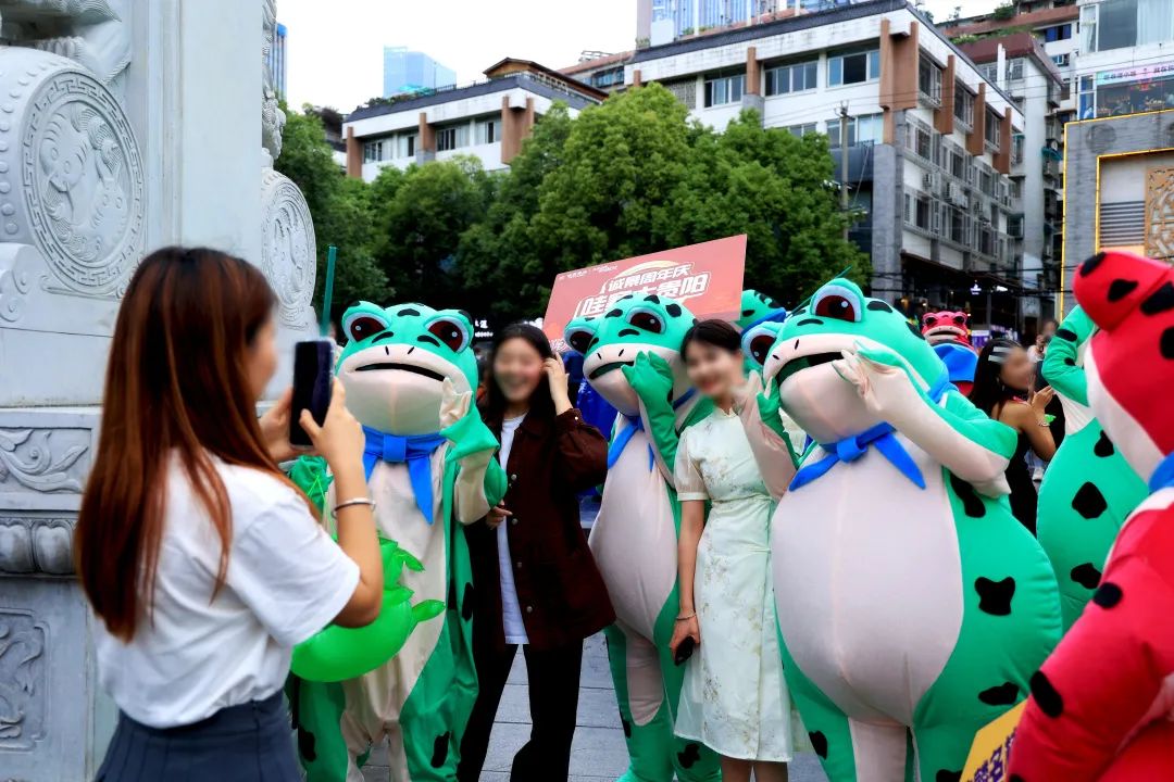 手举吸人眼球的青蛙牌,网红青蛙巡游互动聚集人流,全城发起竹竿舞与小小花园舞蹈挑战,每只网红蛙的身旁,全城市民争相合影打卡与互动。