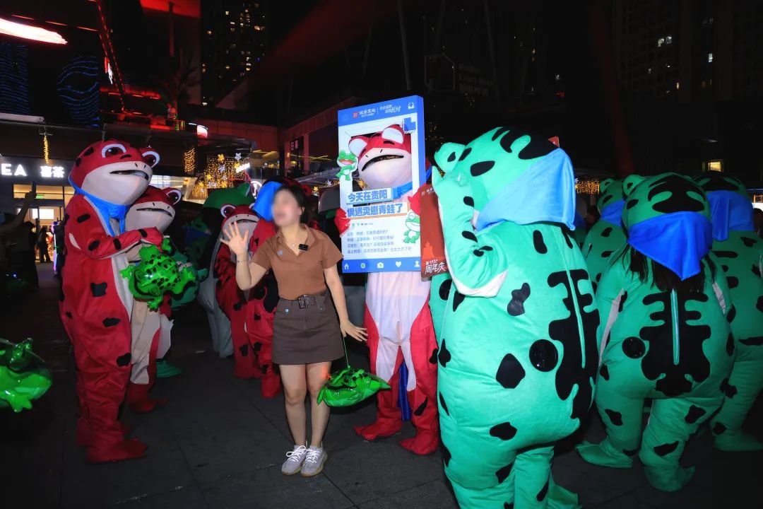 从甲秀楼、青云集市再到花果园,从振华广场、大上海万达广场再到益田假日广场,贵阳重要地标地点及商圈都有网红蛙的身影出没。