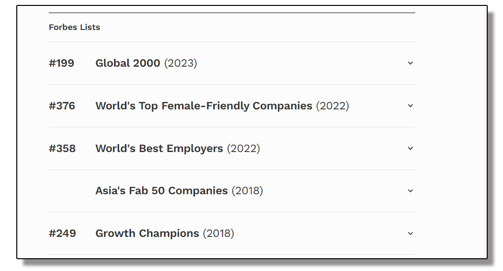 《福布斯》杂志每年评选出"全球上市公司2000强",排名以营业收入、利润、资产和市值的综合评分为依据,对世界上最大的公司进行排名。2023年榜单上的公司销售额为50.8万亿美元,利润为4.4万亿美元,资产为231万亿美元,市值为74万亿美元。累计利润、资产和市值均较去年略有下降。全球上市公司2000强共有58个国家的公司入围,美国以611家公司位居榜首,中国(包含港澳台)以391家公司排名第二。