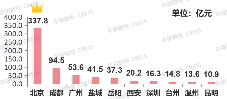 榜单总额环比倍增,过半入榜城市收金不足35亿元。一城市占据榜单三席,北京收金337.8亿领跑榜单。