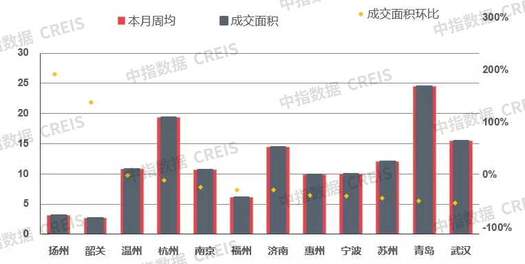 图:二三线重点城市成交面积环比涨跌幅
