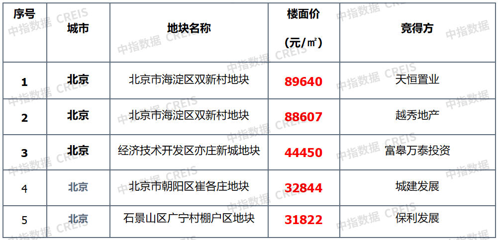宅地单价TOP5:榜单均价环比上行,北京独占榜单五席