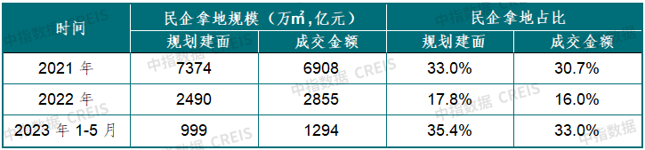 2023年以来,地方国资已无力托底,导致央国企及民企拿地占比有所提升。1-5月,22城中民企拿地金额为1294亿元,仅为2022年45%,绝对规模仍在低位。