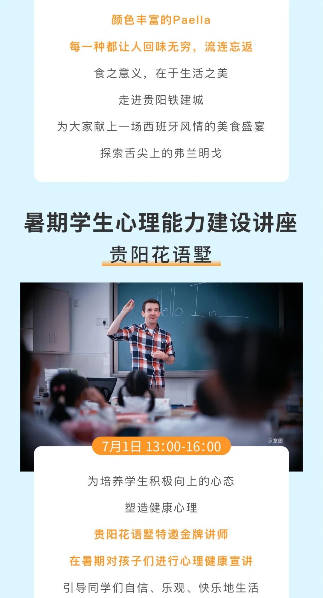7月1日13:00-16:00,为培养学生积极向上的心态,塑造健康心理,贵阳花语墅特邀金牌讲师在暑期对孩子们进行心理健康宣讲,引导同学们自信、乐观、快乐地生活,同时还有解压互动小游戏黏土手作,在娱乐中看到孩子未来眼中的世界,配合炎炎夏日,提供鲜榨冰镇果汁,精致能量冷餐为孩子们蓄力。