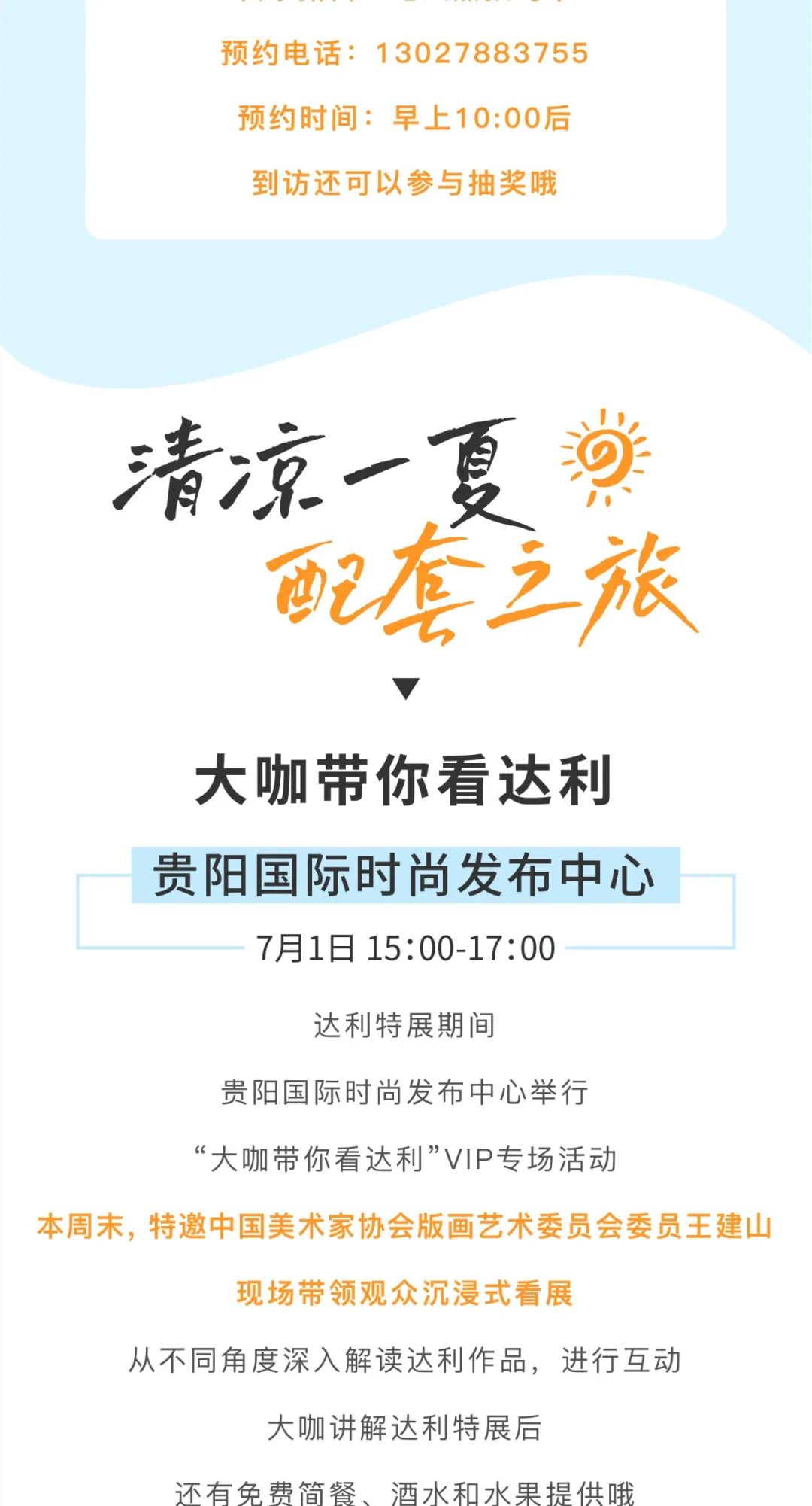 7月1日15:00-17:00,达利特展期间,贵阳国际时尚发布中心举行“大咖带你看达利”VIP专场活动,本周末,特邀中国美术家协会版画艺术委员会委员王建山,现场带领观众沉浸式看展,从不同角度深入解读达利作品,进行互动,大咖讲解达利特展后,还有免费简餐、酒水和水果提供。