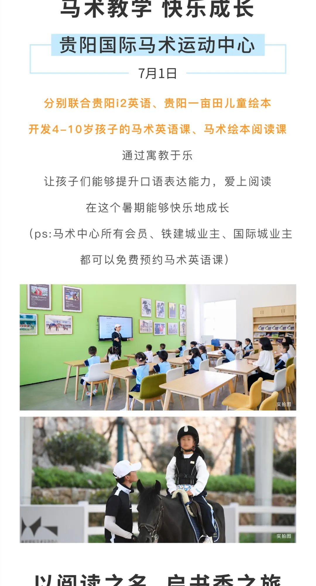 7月1日,分别联合贵阳引i2英语、贵阳一亩田儿童绘本,开发4-10岁孩子的马术英语课、马术绘本阅读课,通过寓教于乐,让孩子们能够提升口语表达能力,爱上阅读,在这个暑期能够快乐地成长。马术中心所有会员、铁建城业主、国际城业主都可以免费预约马术英语课。
