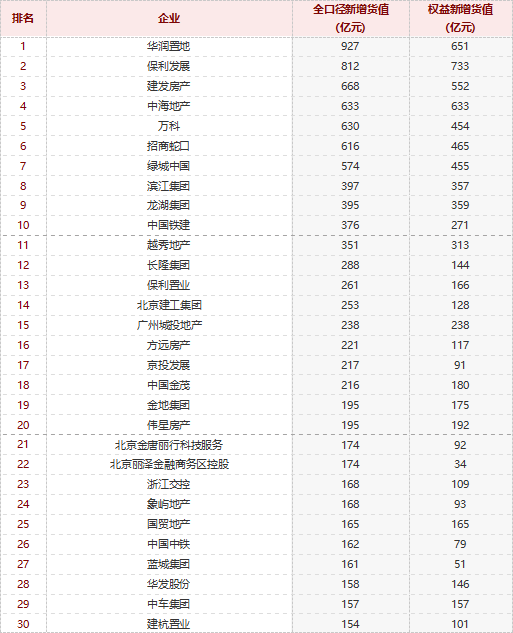 从新增货值来看,华润置地、保利发展、建发房产占据榜单前三位。2023年1-6月,华润置地以累计新增货值927亿元占据榜单第一;保利发展、建发房产紧随其后,累计新增货值规模分别为812亿元和668亿元。