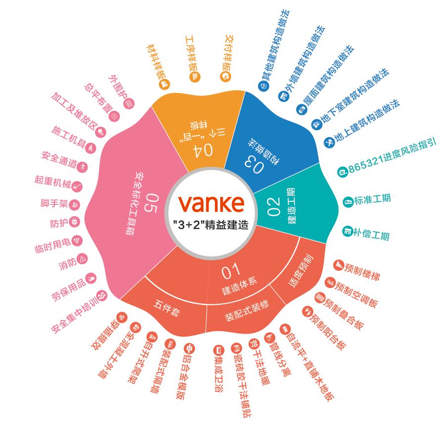 通过分析研究现场各项管理指标,万科提炼总结出了一套完善的现场管理工具,精益建造“3+2”体系制度标准:三个标准——建造体系、建筑构造做法、标准工期;两个管理工具——三个一百样板、安全标准化工具箱,让客户、业主零距离接触产品的“真材实料”,全方位展示“透明的”万科品质,确保交付高质量产品。