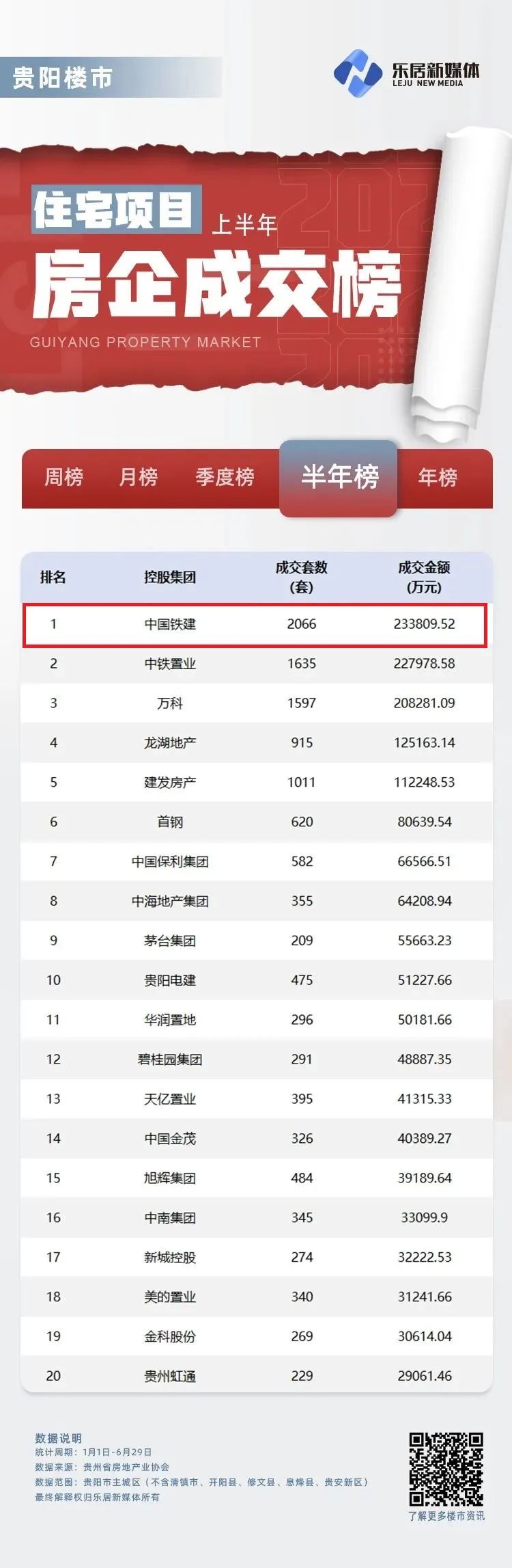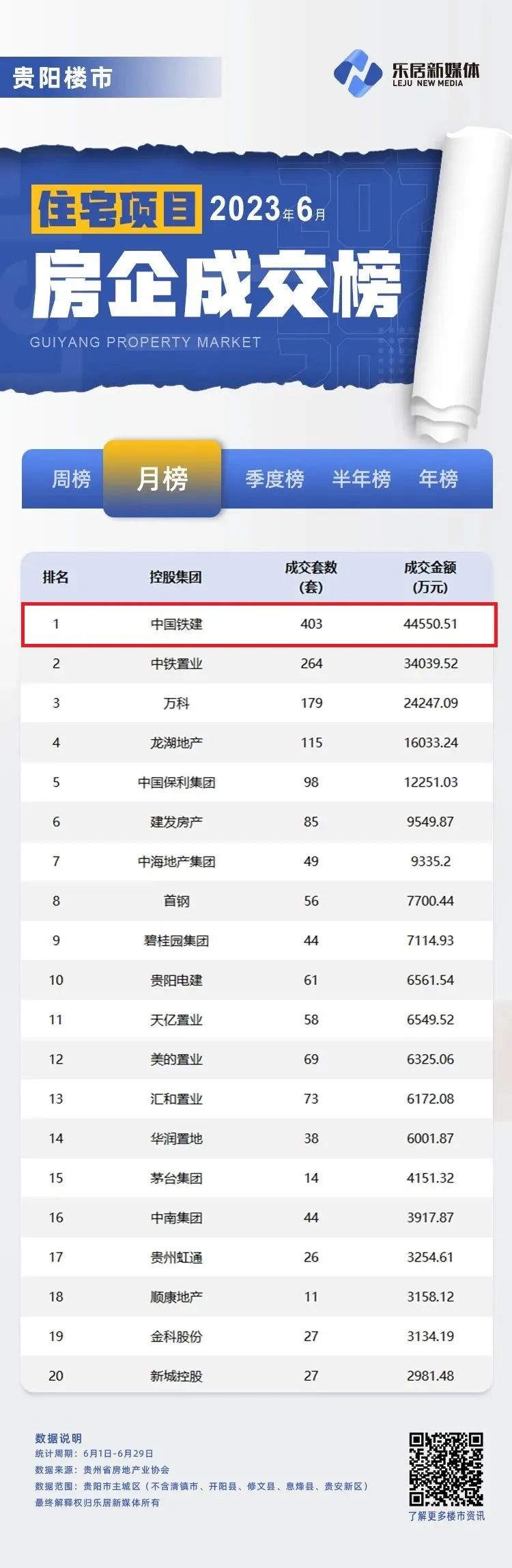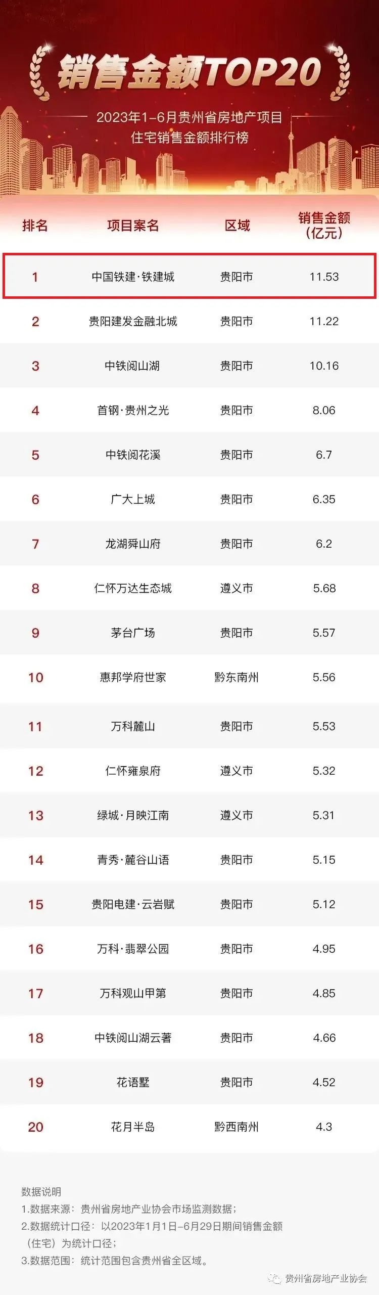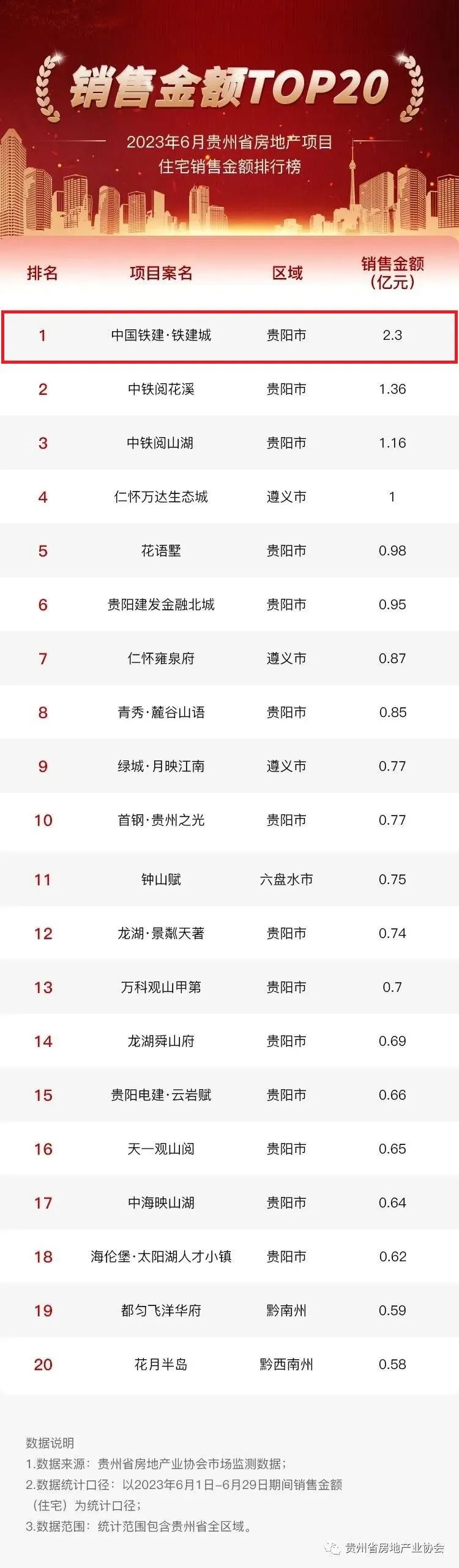 中国铁建地产贵州公司继2022年以35.3亿销售金额成为全市房地产企业年度销售冠军后,在2023上半年及6月贵阳市企业住宅销售金额排行榜中再次荣获双第一,持续卫冕。