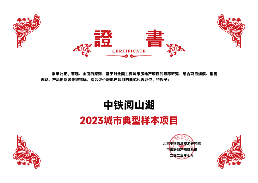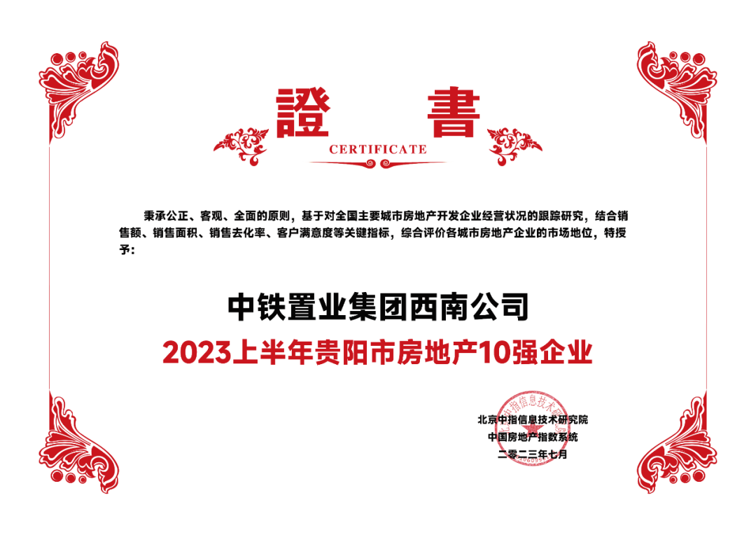 2023年7月6日,由北京中指信息技术研究院主办,中国房地产指数系统、中国物业服务指数系统承办的“中房指数2023房地产市场趋势报告会”在北京隆重召开。中铁置业战略升级,多维发力,凭借其城市综合服务能力,荣获“2023上半年贵阳市房地产10强企业”,同时,中铁阅山湖、中铁·阅花溪荣获“2023城市典型样本项目”荣誉。