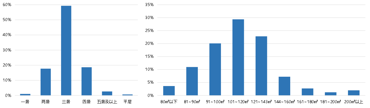 居住居室分布:三居仍是主力户型,占比59.3%;居住面积分布:101-120㎡户型为主,占比29.4%。
