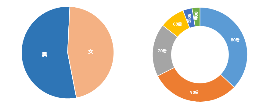 性别分布:男性受访者占比较女性受访者高7.6%;年龄分布:80后/90后占比67.6%,话语权最大。