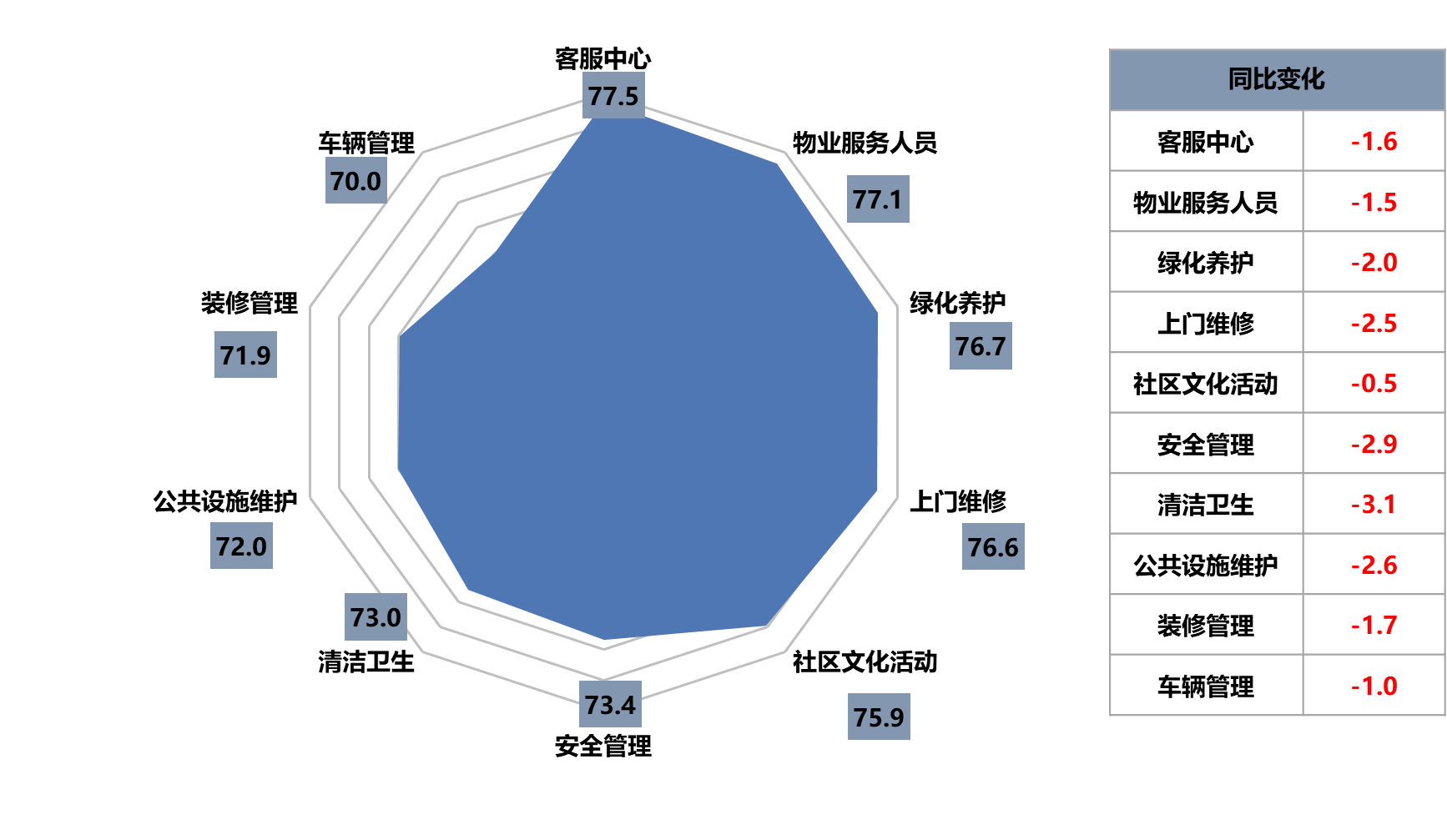 物业服务满意度连续下滑,且降幅进一步增加,得分已降至72.6分