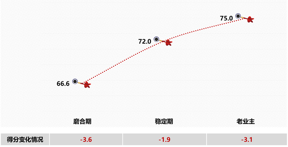 磨、稳、老得分同步下滑,磨合期、老业主降幅更明显