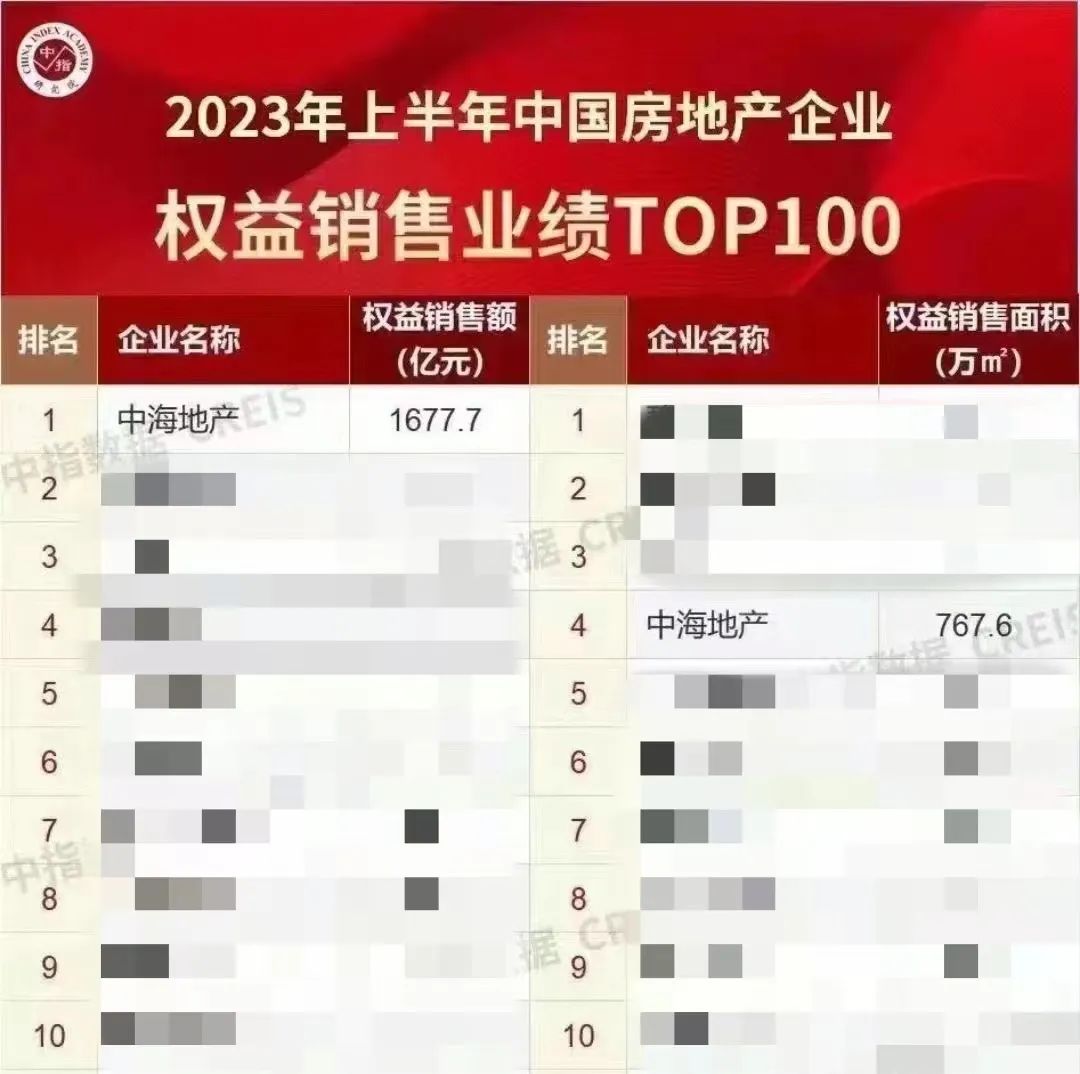 近日,据中指研究院统计,2023年上半年中国房地产企业权益销售业绩榜单出炉。中海地产权益销售额排名前列,权益销售面积排名第4,一如既往地呈现出央企的稳健发展以及对高端改善市场的引领。
