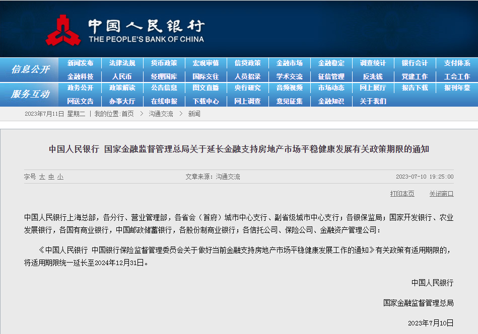 7月10日晚,中国人民银行、国家金融监督管理总局发布关于延长金融支持房地产市场平稳健康发展有关政策期限的通知。