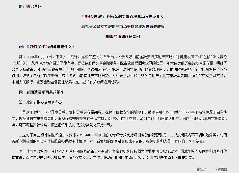 通知显示,《中国人民银行中国银行保险监督管理委员会关于做好当前金融支持房地产市场平稳健康发展工作的通知》有关政策有适用期限的,将适用期限统一延长至2024年12月31日。