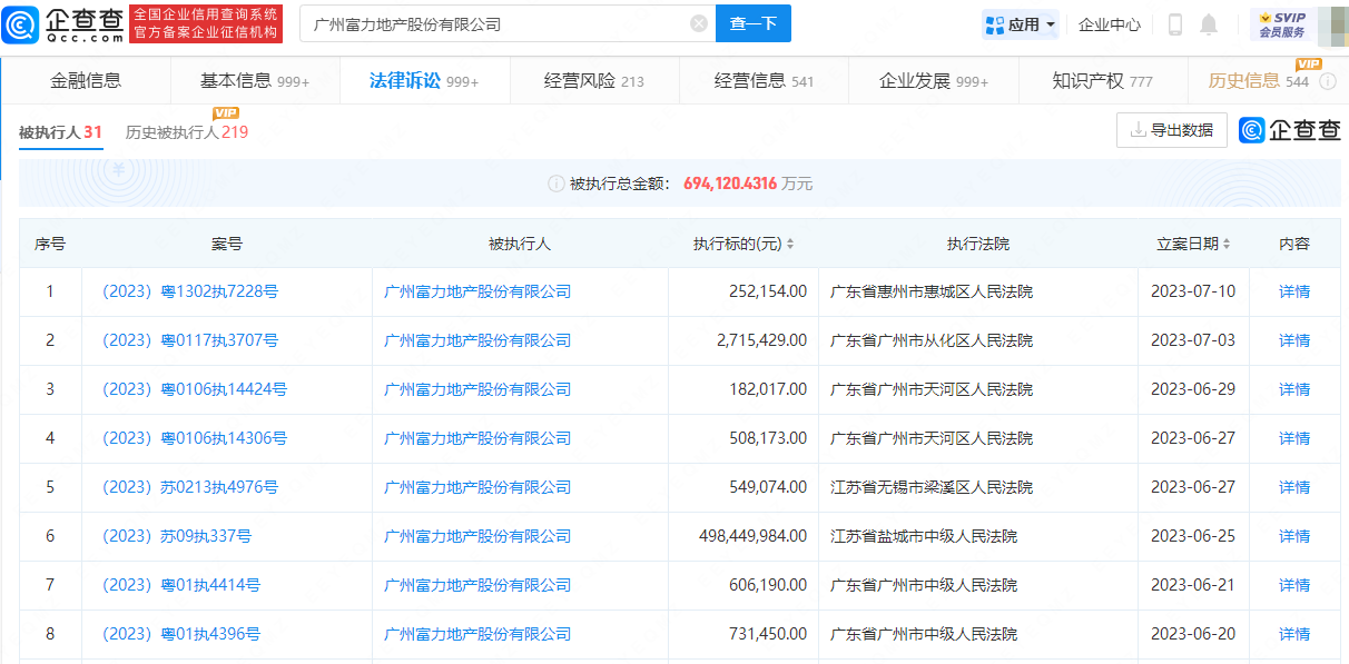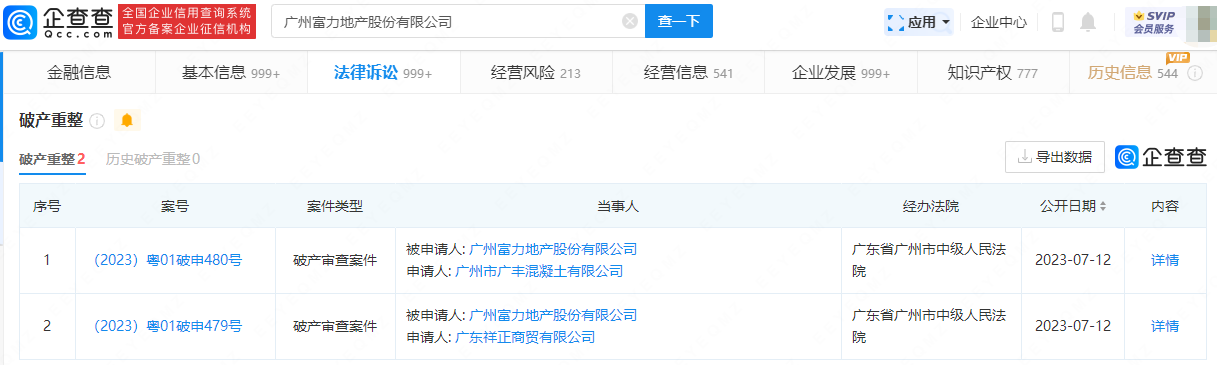 此外,企查查APP也显示,近日,广州富力地产股份有限公司新增2条破产审查案件,申请人分别为广州市广丰混凝土有限公司、广东祥正商贸有限公司,经办法院均为广东省广州市中级人民法院。