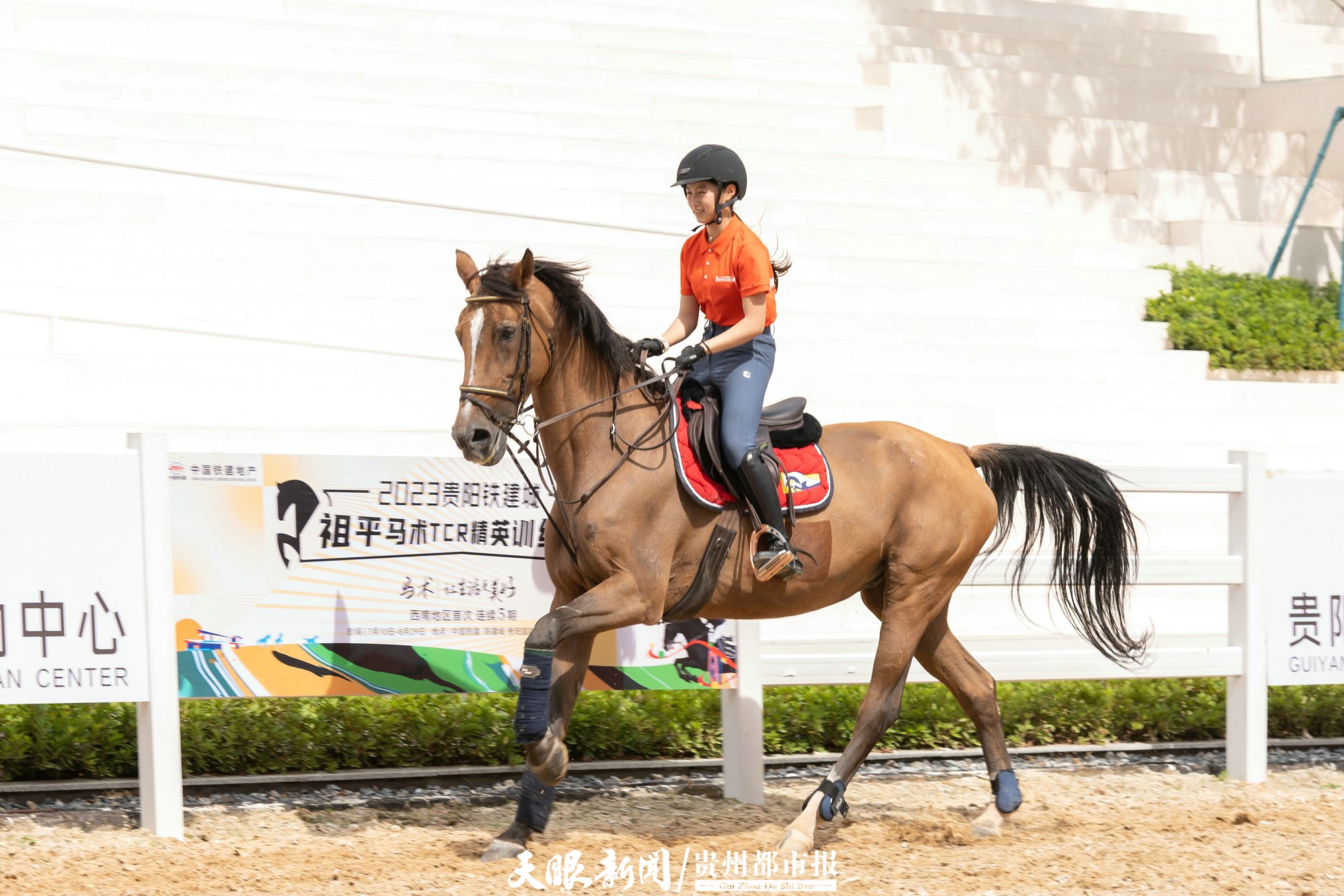 7月12日上午,在贵阳国际马术运动中心训练场上,祖平马术TCR精英训练营员朱思琳Celine与训练马完成了障碍跳跃训练。