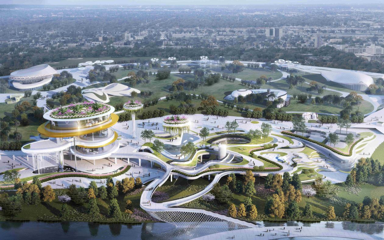 桥亦风景,风景亦桥,天空之桥充分结合其景观性、功能性,引入花溪资源,构建空间立体化、景观层叠化、城市建筑一体化体系,打造花溪城市门廊;充分糅合周边商业、旅游资源,改变商业的传统形态,提升商业溢价促进商业形态升级;连接湿地公园景观,融入场地文化,将商、文、旅三者有机结合创建十里河滩湿地景区又一景点,完成空间体系升级,以三大升级体系打造城市特色名片。
