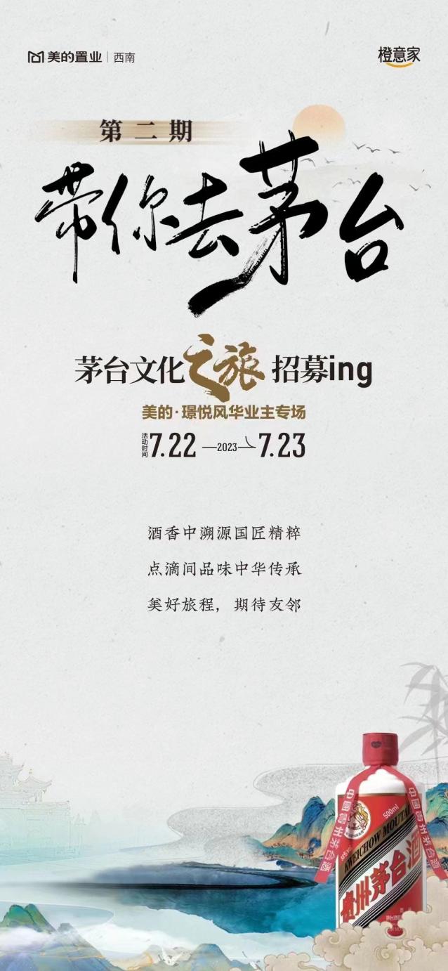 7月17日,美的置业西南区域对外发布宣传海报,《带你去茅台》第二期启动招募,贵阳美的璟悦风华业主专场报名预约中,此次活动时间为7月22日-23日。