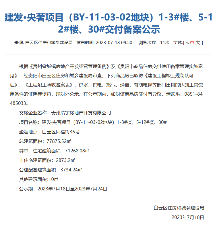 7月18日,白云区住房和城乡建设局发布交付备案公告,建发央著项目(BY-11-03-02地块)1-3号楼、5-12号楼、30号楼已通过交付备案审核,现对外公示。