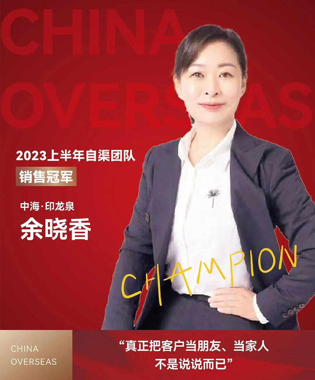 余晓香朴实的诚挚打动过许多坚定跟随她的客户,她真诚地向客户推荐心中的好房子,为客户出谋划;当客户成为业主后,也同样用心维系,用真心换来一波又一波的“粉丝”。
