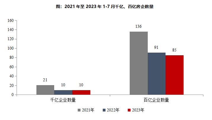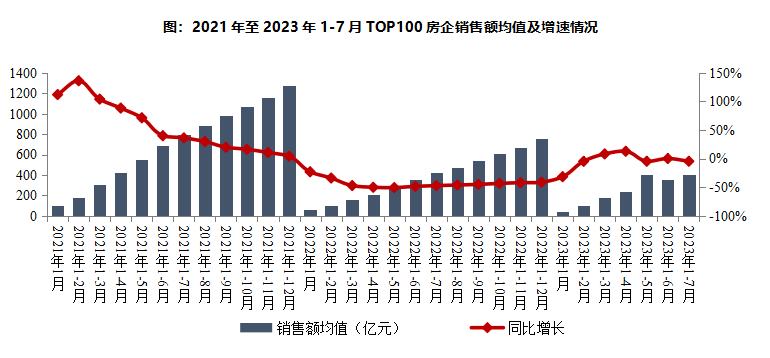 2023年1-7月,TOP10阵营房企销售额保持增长。其中,TOP10房企销售额均值为1725.5亿元,较上年增长0.5%;TOP11-30房企销售额均值为544.7亿元,较上年下降4.2%;TOP31-50房企销售均值为271.2亿元,较上年下降9.7%;TOP51-100房企销售额均值为127.4亿元,同比下降13.3%。