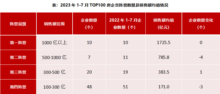 2023年1-7月,百亿以上阵营企业数量减少。具体来看,千亿以上阵营10家,与去年同期持平,销售额均值1725.5亿元。第二阵营(500-1000亿)企业7家,较去年同期减少4家,销售额均值785.8亿元。第三阵营(300-500亿)企业20家,较去年同期增加1家,销售额均值383.5亿元。第四阵营(100-300亿)企业为48家,较去年同期减少3家,销售额均值171.0亿元。