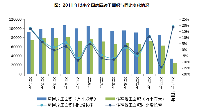 2023年以来,在“保交楼”相关举措不断落实下,全国房屋竣工表现持续改善。2023年上半年,房地产开发企业房屋竣工面积33904万平方米,同比增长19.0%,其中,住宅竣工面积24604万平方米,同比增长18.5%。
