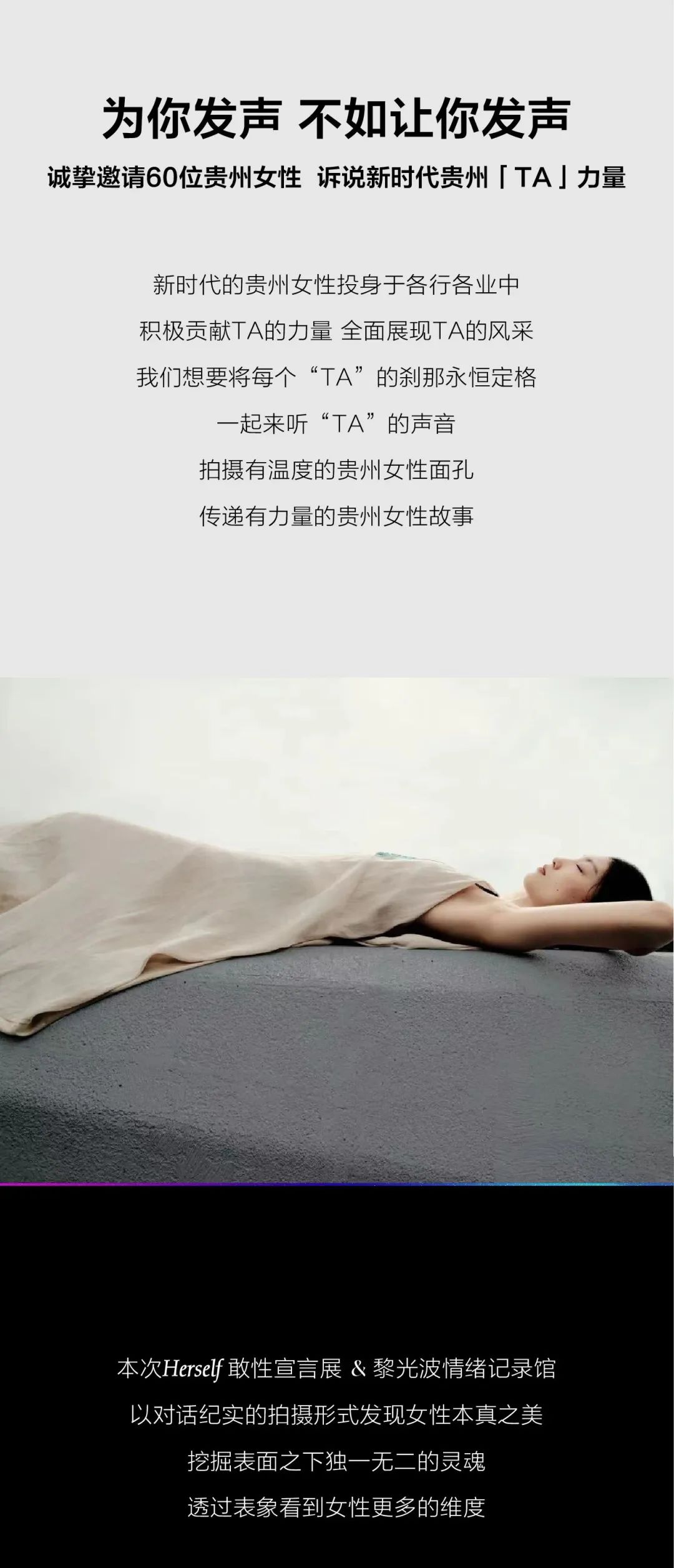 中铁·阅花溪携手青年摄影艺术家黎光波,诚挚邀请60位贵州女性,拍摄和记录她们有趣而独立的灵魂,来一场线上线下结合的艺术摄影展,聆听你的敢性表达,分享你的悦己人生。