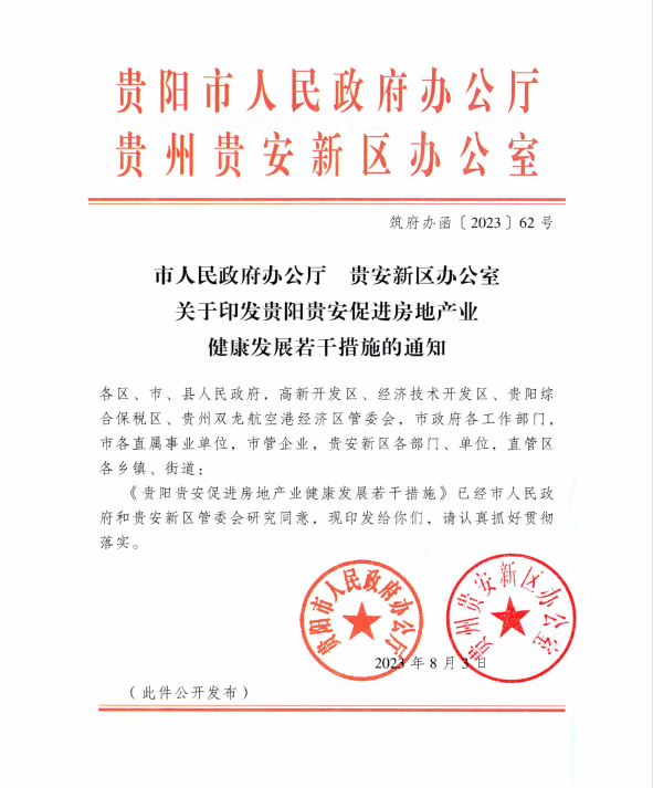 近日,贵阳市人民政府办公厅贵安新区办公室关于印发贵阳贵安促进房地产业健康发展若干措施的通知。
