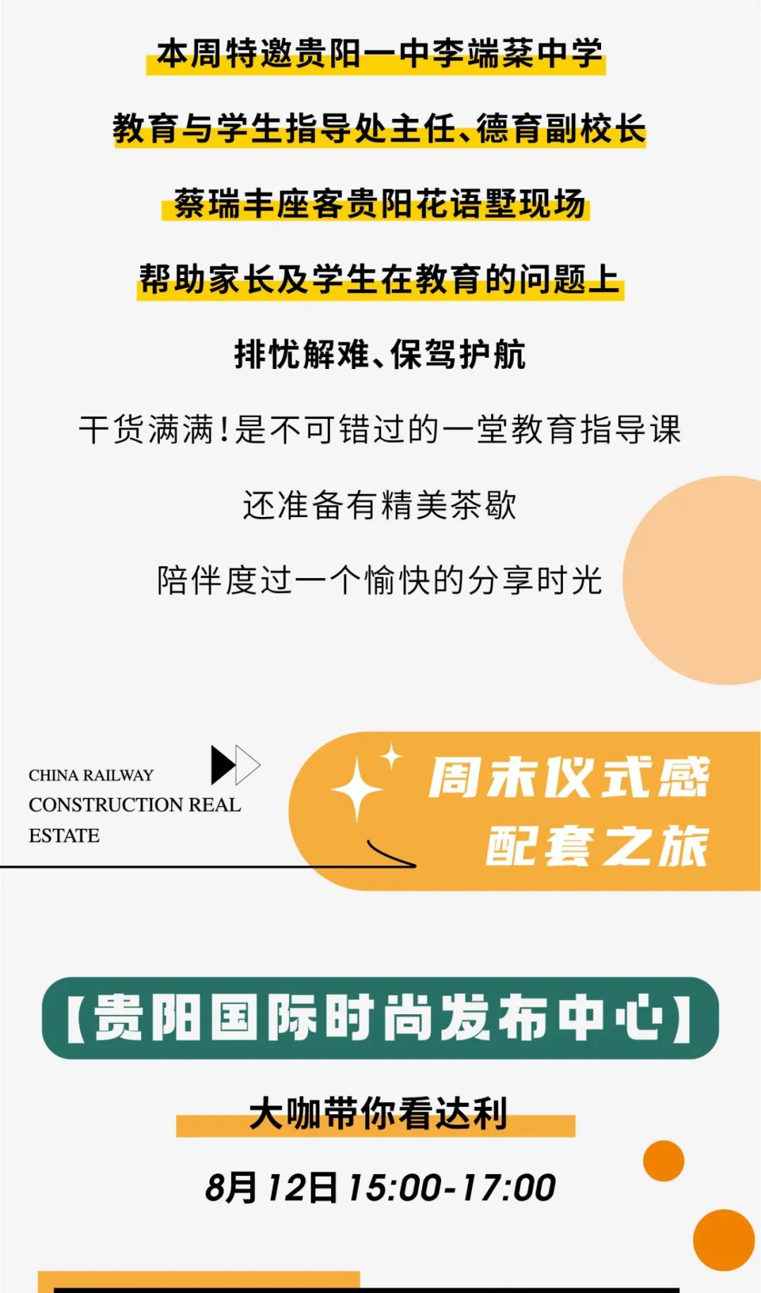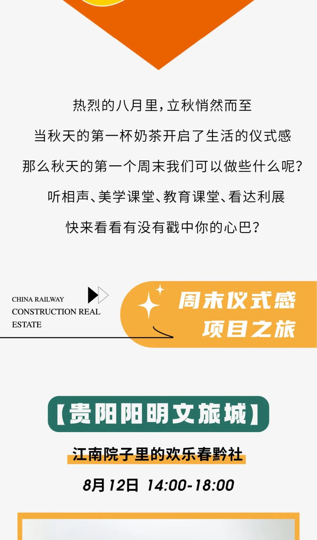 中国铁建地产贵州公司8月12-13日活动预告来袭,听相声、美学课堂、教育课堂、看达利展……出发吧,与秋天的第一个周末热情相约。