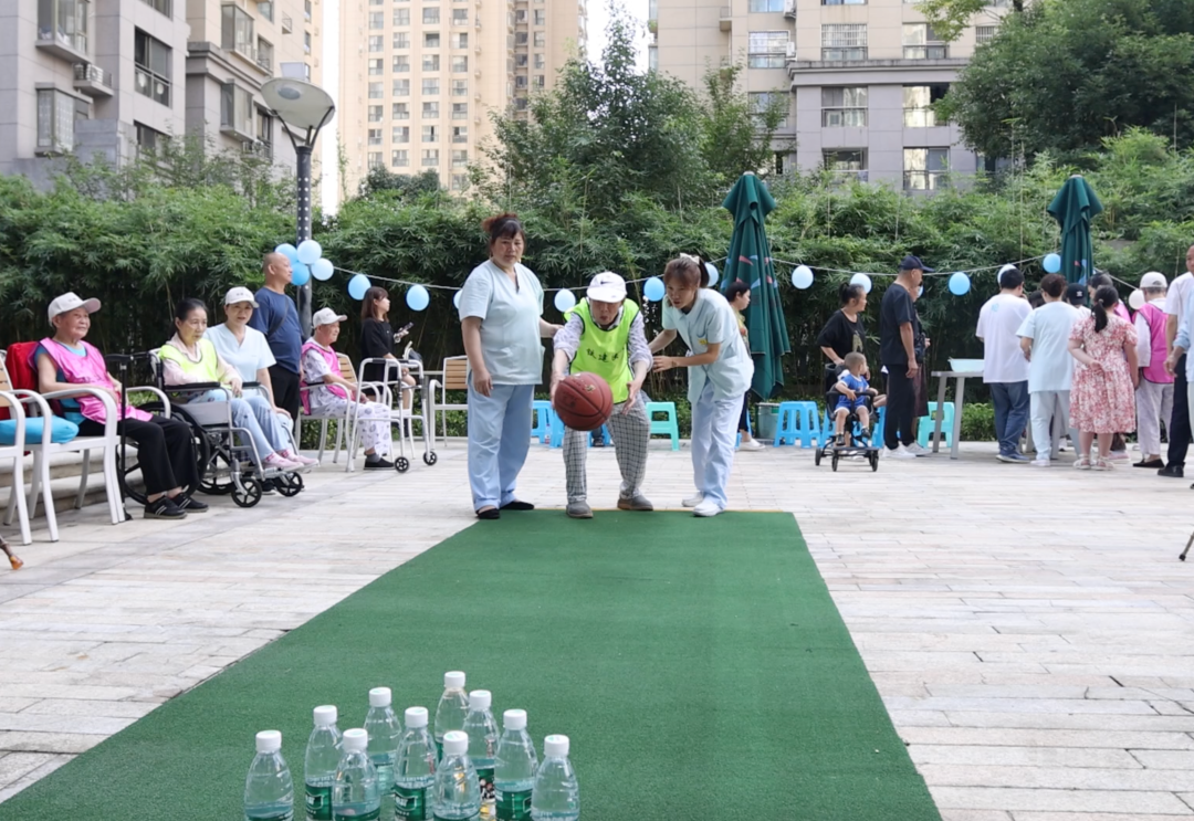 首先,进行的是“保龄篮球”。长者们站在指定位置,将矿泉水球瓶一一击倒。得分不断累积,气氛越发热烈,长者们不断尝试着挑战自我。