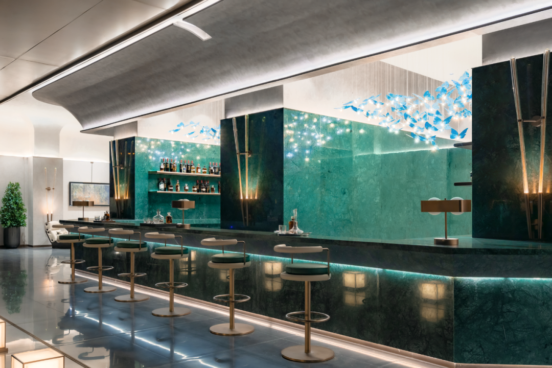 全部的奢石石材、灯光打下来都可以看到石头本身纹理,从墙壁到吧台台面,再到吧台下方,以及每一寸连接处细节。