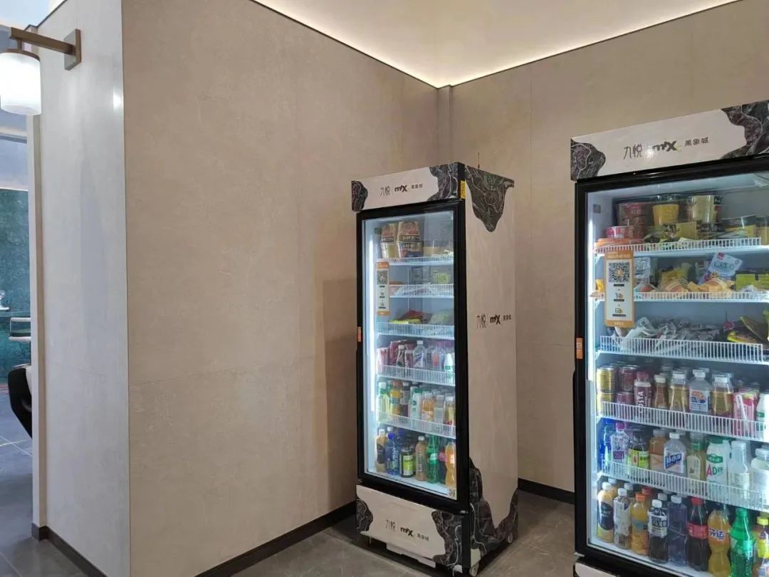 超级兑现,兑现场景、兑现生活、 兑现的一种态度。现场有一个很有意思的一个细节,身后项目还在建,然后艺术长廊里居然就放了两台自动售货机,而且里面还琳琅满目地放着货品。