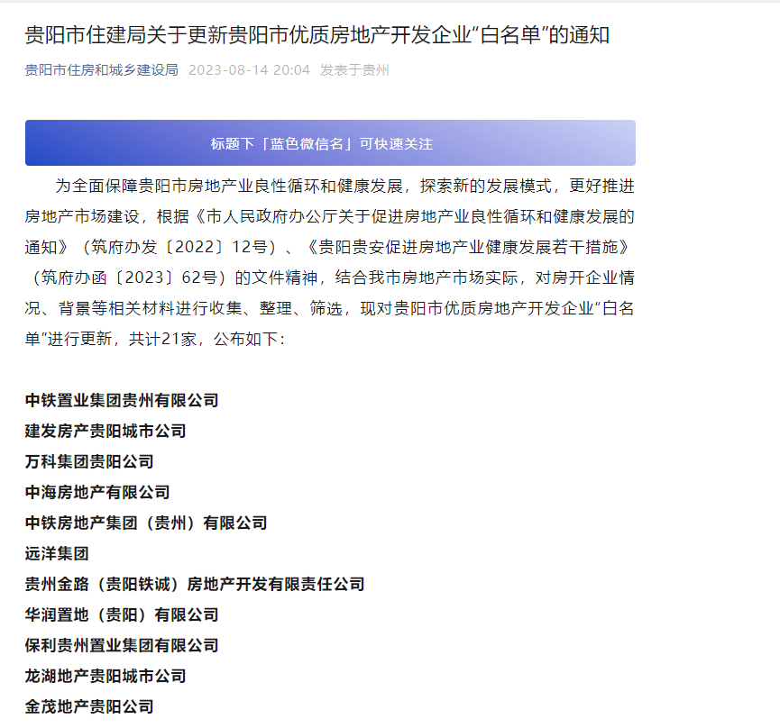 此外,该名单更新后,2022年8月12日发布的《贵阳市住房和城乡建设局关于发布首期企业“白名单”的通知》自动作废。