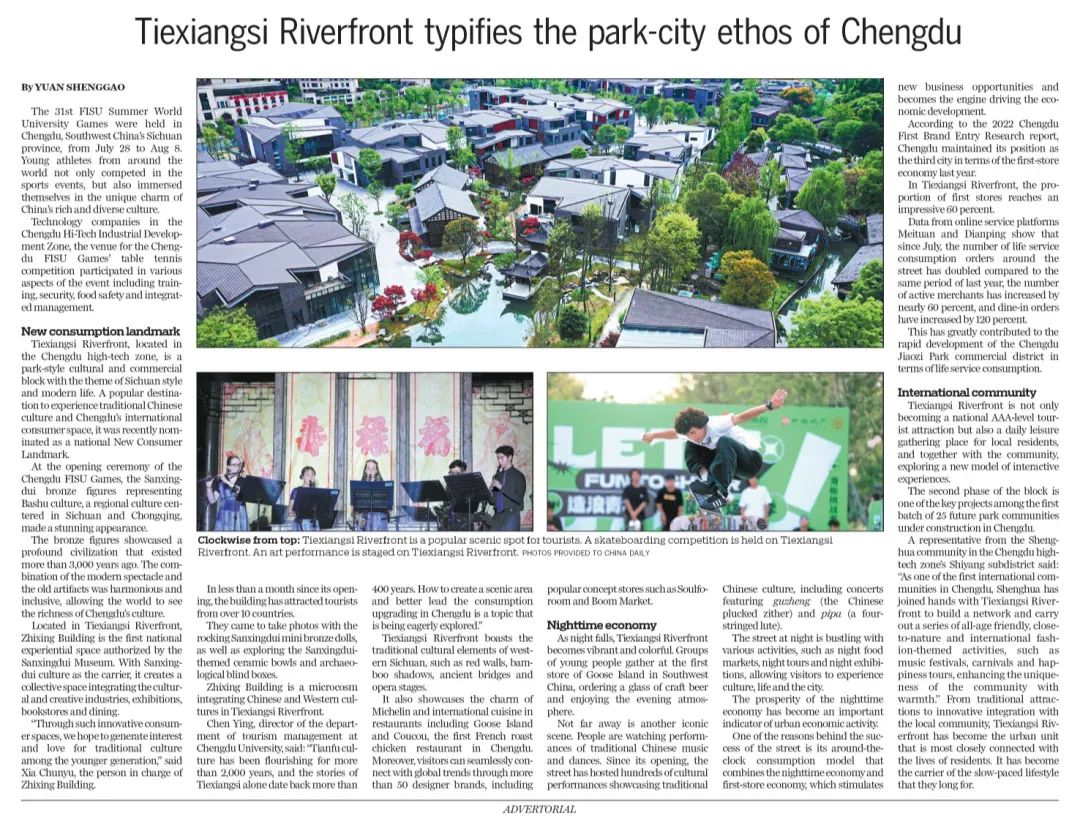 近日,第三十一届世界大学生夏季运动会闭幕式在四川省成都市隆重举行,持续12天的精彩赛事落下帷幕。“成都成就梦想”的呐喊还萦绕耳畔,回顾这场青春盛会,中海商业对外轻资产管理拓展的首个城市级集中商业项目——成都铁像寺水街作为此次大运会官方指定的16个文化展示交流活动点位之一,立足表达“休闲之都”的城市文化内涵,以“公园城市”的“公园商业”为核心,展示出多元融合的文化新生和蓬勃的消费潜力,成为成都又一张城市文化名片和街区式商业消费新地标。